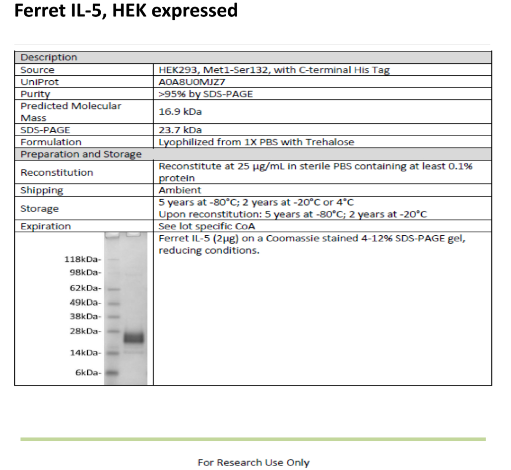 Ferret IL-5 (2µg) on a Coomassie stained 4-12% SDS-PAGE gel, reducing conditions.