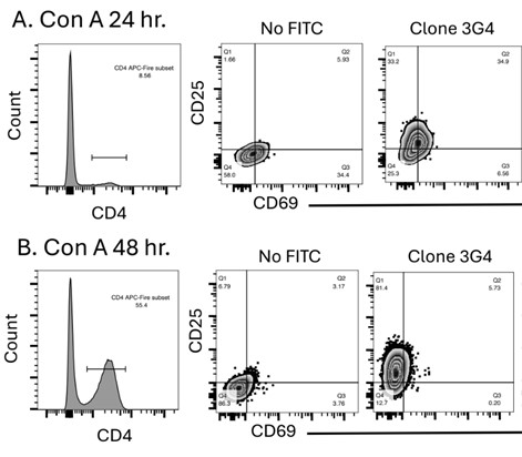 Anti-CD25 clone HM25-3G4 binding increased on CD4 cells after 24 h and 48 h activation with Con A.