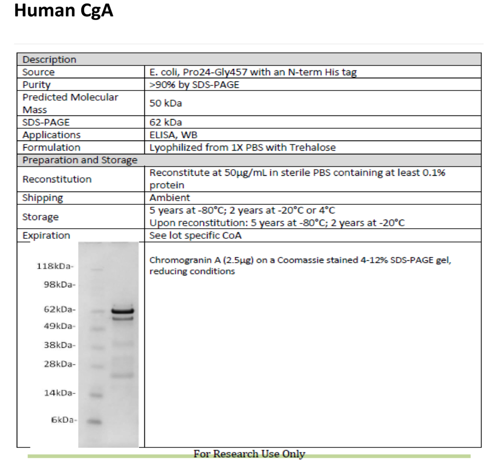 Chromogranin A (CgA), UniProt # P10645, is a 439 amino acid member of the granin family of secretory proteins. Found in vesicles of neuroendocrine cells, CgA is considered a valuable marker for neuroendocrine tumors. CgA is a precursor to a number of biologically active peptides including vasostatin I, parastatin, and pancreastatin.