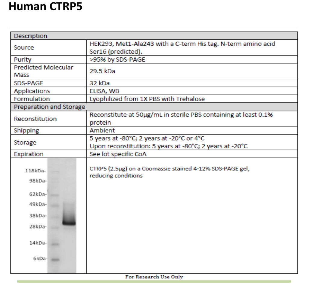 Complement C1q tumor necrosis factor-related protein 5 (CTRP5), Uniprot # Q9BXJ0, is a member of the CTRP family of proteins that share structural and functional similarity to adiponectin. CTRP5 is an important molecule in metabolism regulation and is expressed in a variety of tissues such as spleen, testis, and adipose. Elevated circulating levels have been observed in obesity associated diabetes in animal models.