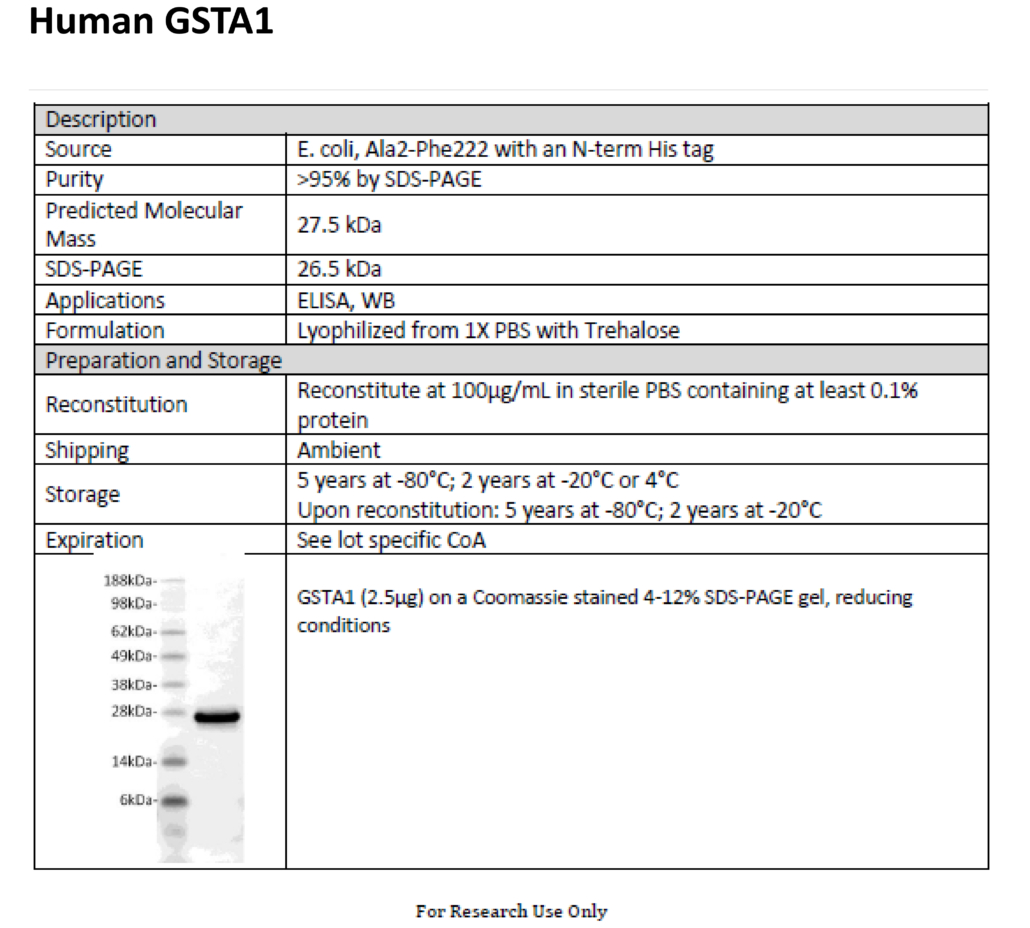 Glutathione S-Transferase A1 (GSTA1) is a member of a family of enzymes that play a role in detoxification through the conjugation of glutathione. GSTA1 is the most expressed GST in the liver and is thought to be crucial to systemic detoxification.