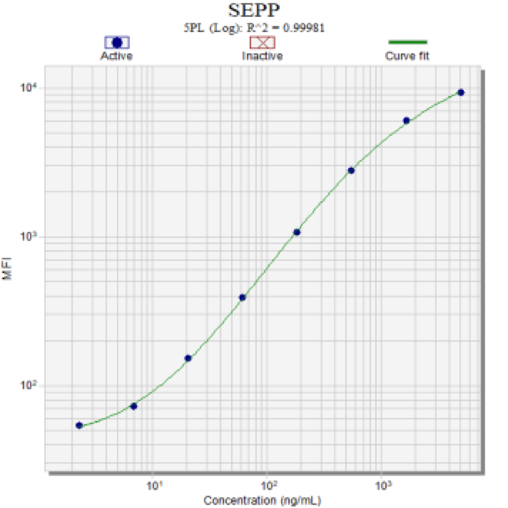 Selenoprotein P (SEPP), UniProt # P49908, is a secreted glycoprotein and contains the majority of selenium in plasma. Produced mainly in the liver, SEPP is comprised of 2 domains, with the N-terminal containing 1 selenocysteine and the C-terminal domain containing 9. SEPP’s ability to transport of selenium plays a role in a number of different processes, including response to brain injury and parasitic infection.