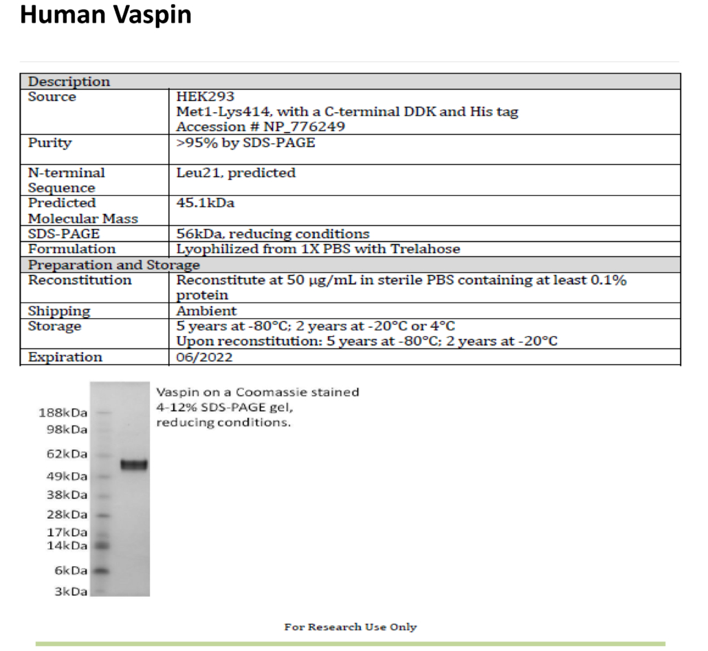 Visceral adipose tissue-derived serpin (Vaspin) aka SerpinA12, UniProt # Q8IW75, is an adipokine originally isolated from visceral adipose tissue and is a member of the Serpin family of serine protease inhibitors. Increased levels of vaspin are observed in obesity as well as type 2 diabetes and its expression positively correlates to body mass index and insulin sensitivity.