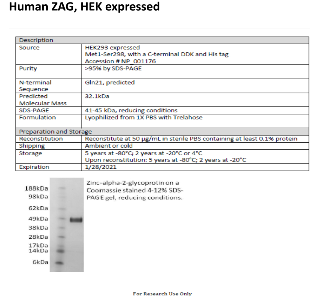 Zinc-alpha-2-glycoprotein (ZAG), UniProt # P25311, is a soluble protein that was first isolated from human plasma. It is over-expressed in a number of malignant tumors and elevated serum levels are seen in prostate and cervical cancer. ZAG has also been shown to play a role in lipid mobilization and utilization.